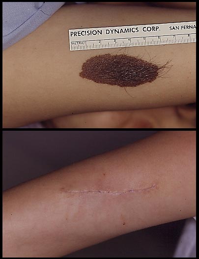 Lo stesso dicasi per le neoformazioni cutanee non pigmentate. A seconda delle caratteristiche della lesione: colore, forma e localizzazione è importante farne controllare periodicamente l'evoluzione con una frequenza che verrà stabilita nell'ambito della prima visita e / o pianificarne l'asportazione chirurgica. Quest'ultima oltre ad avere lo scopo di correggere il difetto sia da un punto di vista funzionale, che da quello estetico permette, quando necessario, attraverso l'esame istologico, di confermare la diagnosi macroscopica e di dare garanzie sulla radicalità dell'escissione.