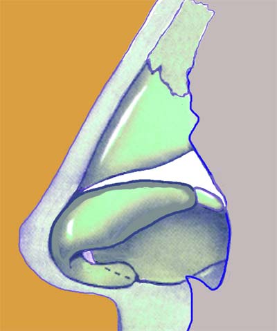 Being the cutis very elastic, the skin excess resulting from the volumetrical reduction of the nasal frame easily shrinks so as to fit the new size. Should the skin of the nasal dorsum be particularly thick, any correction of the skeletal structure will become less evident on the outside. In case the profile needs more projection cartilage grafts will be inserted. The latter can be harvested from the nasal septum or, shouldn't it be possible, from the auricular chonca cartilage. Costal cartilage is taken only in very peculiar cases.